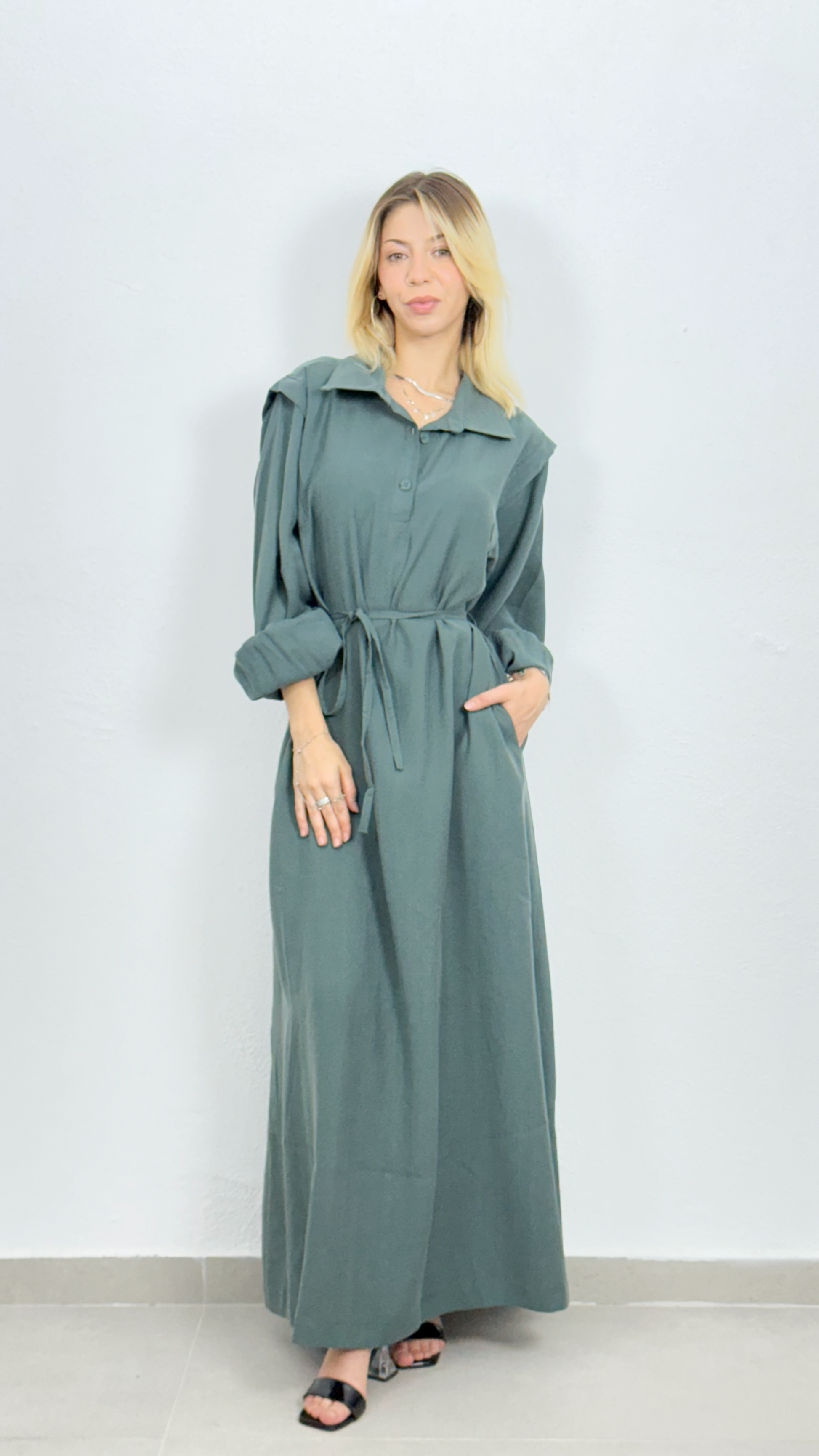Polo Yaka Elbise Petrol. Polo yakadır, önden yarım düğmelidir, kolu parça dikiş aller detaylıdır, biye kuşaklıdır, düşük omuzludur, kolları büzgülü manşetlidir, yandan ceplidir, astarsızdır, iç göstermez. Günlük kullanım ve özel günlerinizde tercih edebilirsiniz.
